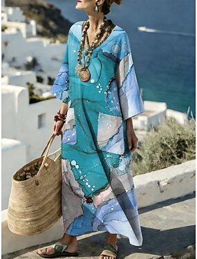 Robe maxi pour femmes en lin respirant léger robe d'été en A vacances décontractées boho plage coupe ample graphique floral manches 3/4 décolleté en V bleu rose violet beige été printemps
