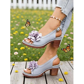 Sandales à talons moyens pour femmes, ornées de fleurs grises – style élégant et décontracté, talon bloc confortable, idéales au quotidien, pour les garden-parties, les voyages et les événements estivaux.