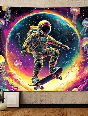 tapisserie murale psychédélique représentant un astronaute, un skateur et un espace, avec des méduses néon, une galaxie, une planète colorée et un style surréaliste. Décoration murale esthétique pour