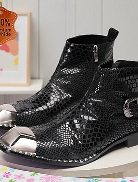Bottes pour hommes en cuir noir à motif serpent avec boucles argentées – un modèle unique pour les influenceurs, idéal pour les fêtes et les événements spéciaux.