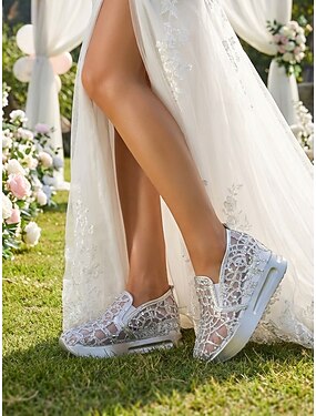 Baskets compensées blanches en dentelle pour femme - chaussures confortables à enfiler ornées de strass, idéales pour un mariage champêtre.