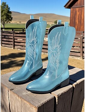 Bottes de cowboy western en denim bleu pour femmes avec détails brodés – bottes à bout pointu mi-mollet pour festivals de musique, événements de rodéo et tenues de style country