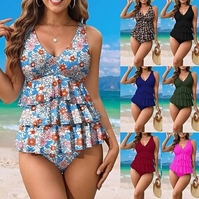 Femmes Maillot de bain à imprimé floral Maillot De Bain Deux Pièces Fleuri Couleur Unie Tropical Col en V Contrôle du ventre Élastique Sans manches Maillot de Bain Surf Plage Vacances Été