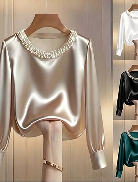 Femmes Chemisier Perlé Couleur Unie Élégant manche longue Col ras du cou Hauts Réguliers Quotidien Travail Noir Blanche Vert Abricot Printemps Automne