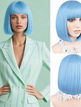 Perruque courte et lisse bleue avec frange, cheveux synthétiques de 12 pouces, aspect naturel, pour une utilisation quotidienne en soirée # bleu bébé