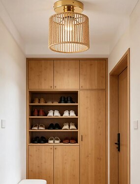 Plafonnier encastré, douille E26/E27, 1 lumière, design lanterne, abat-jour rond en rotin tressé, style bohème, idéal pour une chambre.