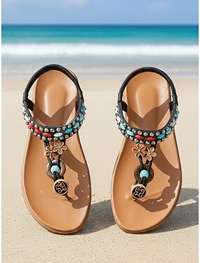 Sandales bohèmes noires pour femmes - chaussures de marche ethniques à bride en T ornées de perles et dotées d'une bride arrière élastique confortable, idéales pour les vacances en plein air et les