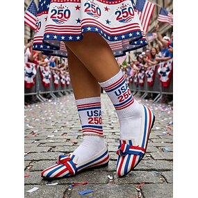 États-Unis 250e Anniversaire Chaussures Plates en Tricot Patriotiques pour Femme – Chaussures Plates à Bout Pointu avec Détail Nœud pour la Journée d'Indépendance Pique-niques d'Été et Port Quotidien