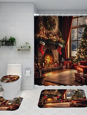 Ensemble de douche quatre pièces comprenant un rideau de douche, un siège de toilette antidérapant et robuste, un tapis de sol de salle de bain, le tout décoré d'un motif de sapin de Noël et du Père