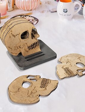 Lot de 6 sous-verres en bois en forme de crâne d'Halloween avec support, décorations de table effrayantes pour fête, dîner de festival, maison hantée ou décoration de bar