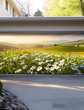 Bannière publicitaire murale extérieure grand format représentant une prairie de marguerites blanches printanières, un paysage naturel et une décoration extérieure résistante aux intempéries.