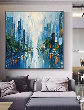 Grande toile bleue, tableau abstrait représentant une vue de ville, idéal pour décorer un salon ou une chambre. Décoration murale moderne turquoise et blanche.