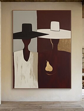Peinture à l'huile abstraite et moderne, représentant un homme et une femme coiffés d'un chapeau, réalisée à la main. Élégante et minimaliste, elle est idéale pour décorer un mur de salle à manger ou