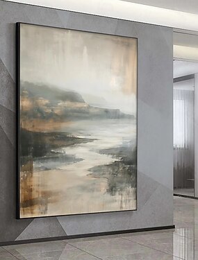 Peinture à l'huile artisanale représentant un lac doré abstrait sur toile, paysage moderne à l'aspect métallique texturé, art mural pour salon, gris neutre et beige, décoration luxueuse