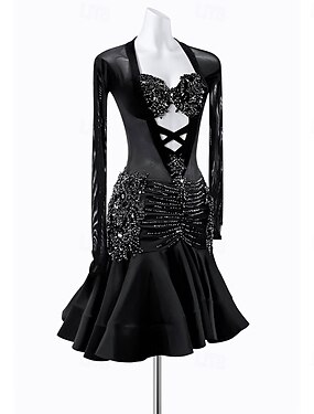 Robe de danse latine noire élégante pour femme - manches longues en tulle transparent, corsage orné de perles et décolleté en cœur &robe de salsa tango à laçage sur le devant et ourlet asymétrique à
