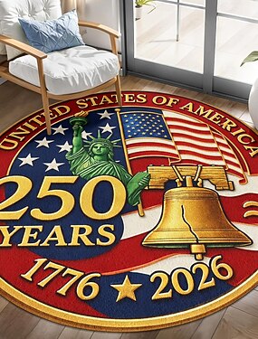 Tapis rond commémoratif du 250e anniversaire des États-Unis, motif 250 ans (1776-2026) avec cloche et statue de la Liberté, décoration de sol ronde patriotique pour les célébrations du