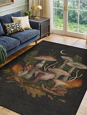 Tapis de sol à motif de champignons et de croissants de lune, inspiré de l'automne, résistant et élégant, pour une ambiance chaleureuse dans le salon. Dessin épisodique.