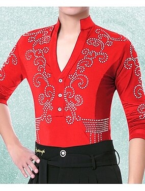 Chemise de danse latine rouge à strass pour homme, décolleté en V profond, manches 3/4, haut de performance de salon