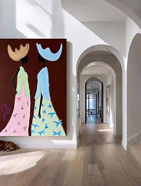 Peinture à l'huile abstraite et colorée faite à la main représentant une femme, style western, avec des sœurs cow-boys. Art mural rétro figuratif sur toile, œuvre originale, décoration murale moderne.