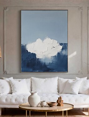 Peinture à l'huile bleu et blanc peinte à la main, style minimaliste moderne, texture bleue, grande toile, art mural pour canapé ou salon