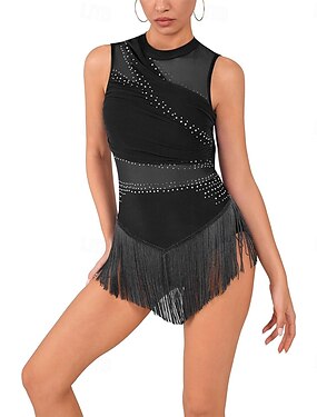 Tenue de danse latine pour femme, noire - body sans manches en maille transparente orné de strass et d'un ourlet à pompons rythmés, idéal pour la scène.