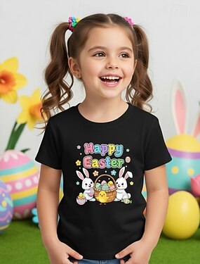 100% Coton Pâques Enfants Fille Bleu Noir Blanche Graphique Lapin T-shirt Col Rond Manche Courte Quotidien Extérieur Actif Streetwear Occasionnel Impression Été Printemps