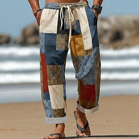 Homme Géométrique Bloc de Couleur Patchwork Pantalons Pantalons Amples Pantalon décontracté Taille Moyenne Mode Maison Extérieur Vacances Taille élastique avec cordon de serrage Pantalon en lin avec