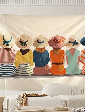 Tapisserie murale rétro style vintage représentant des filles en vacances à la plage, chapeaux de soleil, meilleures amies, idéale pour une chambre, un salon ou une soirée étudiante.