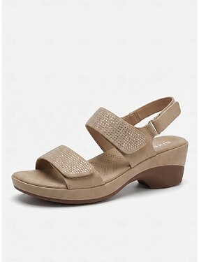 Sandales à talons confortables pour femmes, couleur camel, ornées de strass et dotées de brides réglables – sandales rembourrées avec soutien de la voûte plantaire, idéales pour les voyages, le