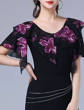 Danse Latine Haut Impression Épissage Femmes Performance Entraînement Manche Courte Haut Polyester