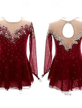 Robe de patinage artistique Femmes Fille Patinage Robe Rouge Patchwork Trou de pouce Spandex Maille Haute Élasticité Entraînement Compétition Tenue de Patinage Classique cristal pailleté manche longue