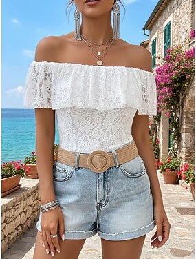 Femmes Chemisier Hauts en dentelle Dentelle Uni Élégant Manche Courte Épaules Dénudées Hauts Réguliers Fête Sortir Blanche Été Printemps
