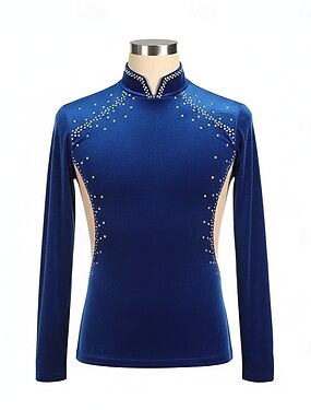 Haut de Patinage Artistique Homme Patinage Hauts Bleu marine Patchwork Élastique Entraînement Compétition Tenue de Patinage Classique cristal pailleté manche longue Patinage sur glace Patinage