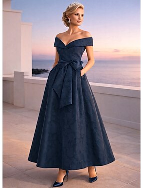Ligne A Longueur au sol Robe de Soirée Robe de Cocktail Robe d'invité de mariage Robe de Mère de Mariée Manche Courte Épaules Dénudées Élégant ancien Mariage Formel Nylon avec Noeud(s) À Bretelles