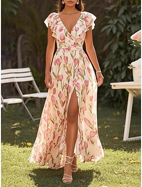 Femmes Robe Maxi Robe maxi Robe en Chiffon Robe Fleurie Robe Imprimée Élégant Moderne Extérieur Vacances Sortir Coupe régulière Fleuri Sans manches Col en V Rose Claire Été Printemps