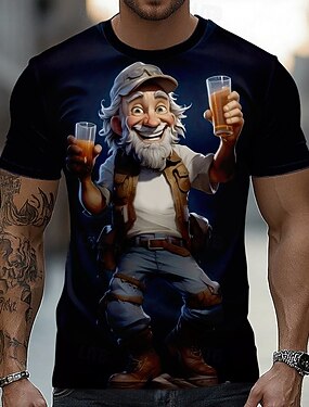 T-shirt humoristique à manches courtes et coupe classique pour homme, représentant un grand-père souriant tenant deux verres de bière. Style dessin animé 3D. Idéal pour les fêtes, les bars et les