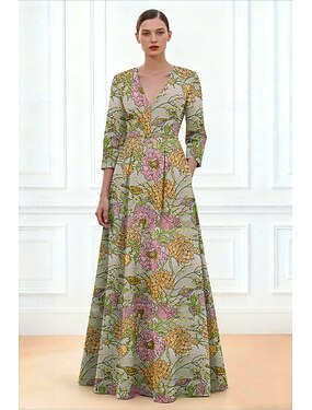 Ligne A Longueur au sol Robe de Soirée Tenue de soirée Élégant Robes semi-formelles Mariage décontracté / de jour Manche 3/4 Col en V Fête de jardin Mariage Poche Jacquard avec Plis Poche
