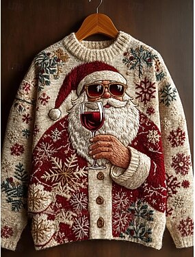 Sweatshirt à Motif Flocon de Neige et Claus pour Femmes de Noël Pullover Décontracté Imprimé Verre à Vin Claus Col Ribbé Manches Longues Hauts Réguliers Tricot Extérieur Week-end Vacances Beige
