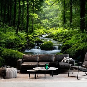 Tapisserie murale 3D représentant une vue sur une forêt et une rivière, avec des arbres verts et une nature préservée. Décoration murale idéale pour le salon ou la maison. Affiche en tissu.