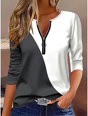 Femmes T-shirt Fermeture éclair Imprimé Graphique Géométrique Bloc de Couleur Élégant ancien Classique manche longue Col rond Encolure en V Hauts Réguliers Quotidien Week-end Gris foncé Printemps