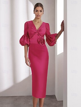 Fourreau Colonne Longueur cheville Robes de Cocktail Robes de soirée Élégant ancien Demi Manches Col en V Formel Poche Satin Italie avec Paillettes Froncé