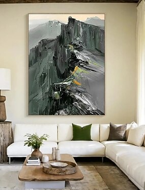 Peinture à l'huile sur toile, réalisée à la main, représentant un paysage de montagne abstrait texturé, idéale pour décorer un salon, une entrée ou un hall. Toile roulée, sans cadre et non tendue.