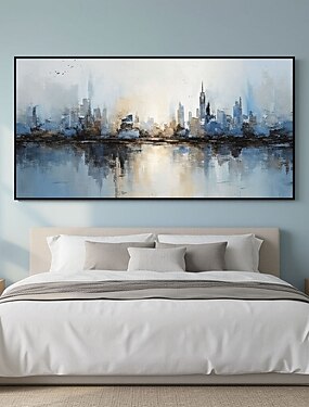 Décoration murale abstraite de paysage urbain, peinture sur toile bleue et colorée sur le thème de la ville, œuvre d'art moderne pour salon, salle à manger, chambre ou bureau.