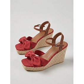 Sandales compensées en daim rouge pour femme - élégantes espadrilles à plateforme avec nœud et bride cheville, idéales pour les croisières de luxe et les séjours en station balnéaire tropicale. &fêtes