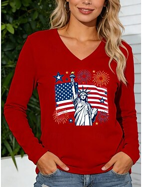 Jour de l'Indépendance Américaine Femmes T-shirt Imprimé Graphique Drapeau Américain Élégant Classique Occasionnel manche longue Col en V Hauts Réguliers Quotidien Sortir Week-end Rouge Gris Clair