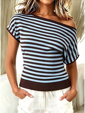 Femmes T-shirt Imprimé Rayé Mode Élégant Occasionnel Manche Courte Asymétrique Hauts Réguliers Occasionnel Quotidien Sortir Bleu Jaune Été Printemps