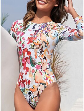 Femmes Maillots de Bain Une Pièce Monokini Maillot de bain Contrôle du ventre Taille haute Mince Dos nu Vacances Tenues de plage Fleuri Col rond manche longue Maillots de bain