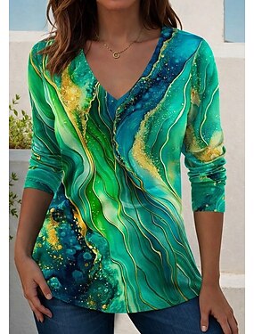 Femmes T-shirt Imprimé Fleuri Graphique Dégradé Élégant ancien Classique manche longue Col ras du cou Col en V Hauts Réguliers Quotidien Frêne Vert et Bleu Arc-en-ciel Été Printemps Automne