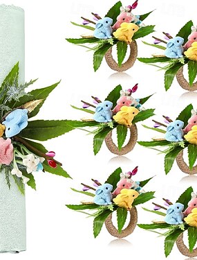 Lot de 6 ronds de serviette lapin de Pâques, porte-serviettes floraux printaniers avec feuilles vertes et 3 mini lapins, boucles style toile de jute rustiques pour un dîner de famille pendant les