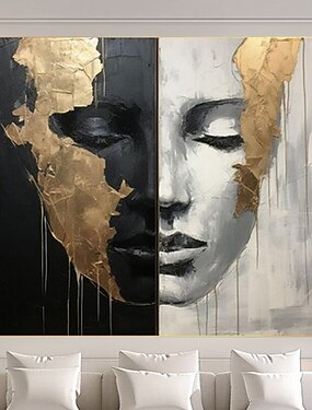 Peintures abstraites de visages de filles peintes à la main sur toile, peinture noire et blanche, œuvres d'art figuratives dorées, peinture murale minimaliste pour la décoration intérieure, cadre